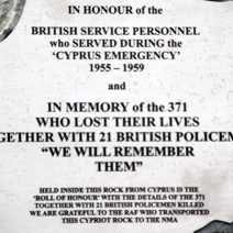 The large piece of rock from the Troodos Mountains in Cyprus had been airlifted back to the UK by the RAF. The insertions on the Memorial, gave names and details of all those that lost their lives, both the British Serviceman and Police Officers which is the first time in history a memorial has been jointly dedicated in this manner.
