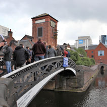 From there we headed onto the largest rise of locks – Farmer’s Bridge Locks, amongst Birmingham’s 100-mile long network – we really do have more Canals than Venice! This took us up through Brindley Place, which is home to some of Birmingham’s best restaurants, bars and attractions such as the National Indoor Arena, Sea Life Centre, Legoland Discovery Centre and much more. We then passed the Malt House pub where Former USA President Bill Clinton famously had a pint whilst visiting and up through the impressive International Convention Centre (ICC) and Symphony Hall before emerging in Centenary Square. There is a lot of building work currently going on in and around Centenary Square but this doesn’t detract from the impressive architecture of buildings such as Birmingham Library and the Hall of Memory. From there we again headed onto the Canal network onto Gas Street Basin, this is a beautiful area which is again surrounded by bars and restaurants. Richard, whose commentary was captivating, told the group that Cliff Richard once made a film in Gas Street Basin!